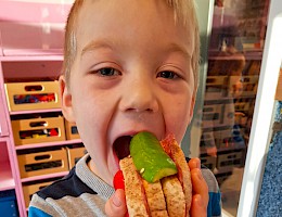 Einmal in der Woche bereiten die Kinder der Bären- und Igelgruppe gemeinsam mit Mitarbeitenden ein Frühstück vor. Nachmittags gibt es eine Zwischenmahlzeit. Lebensmittel beziehen wir möglichst regional, saisonal und in Bioqualität.